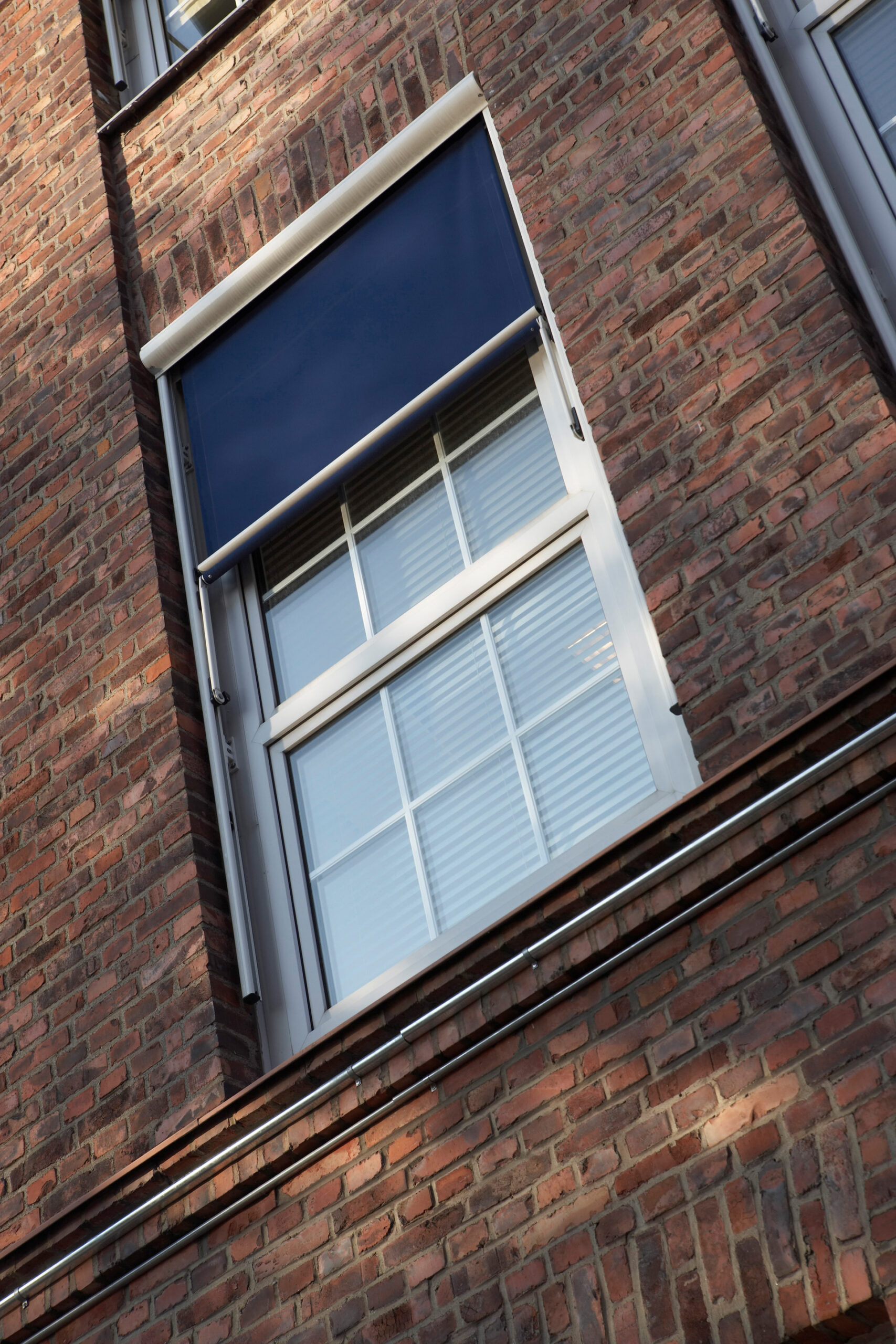 I den övre delen av markisoletten rullas väven ut vertikalt och först i den nedre delen av fönstret fälls armarna ut som på en fönstermarkis.